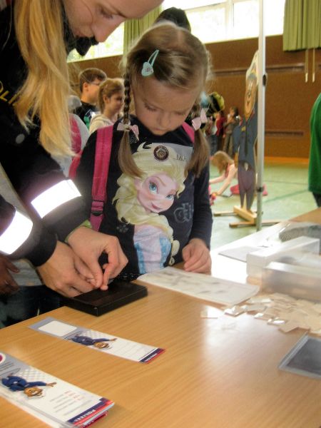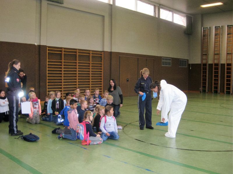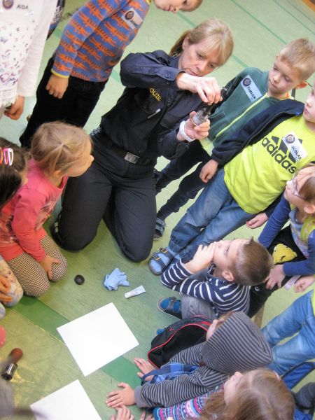Ein aufregender Vormittag für alle Kinder und Lehrerinnen. Gemeinsam mit den Schülern und Schülerinnen der 1a und 1b durften wir 4 Stationen durchlaufen. Highlights: Frau Lang in der Arbeitskleidung der Spurensuche, Fingerabdruck, der Polizeihund