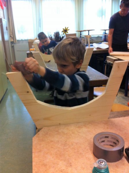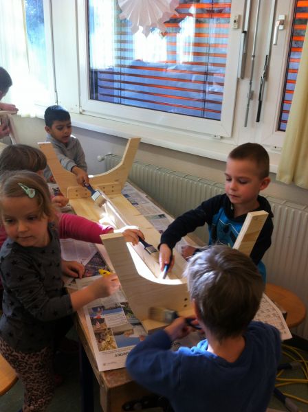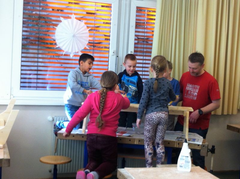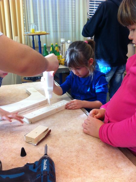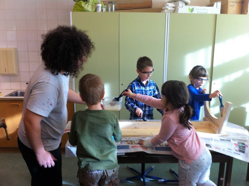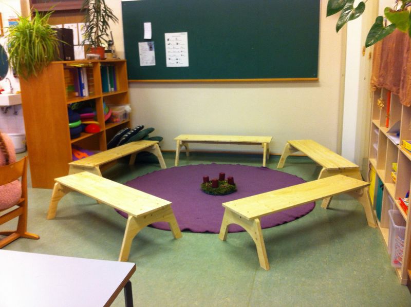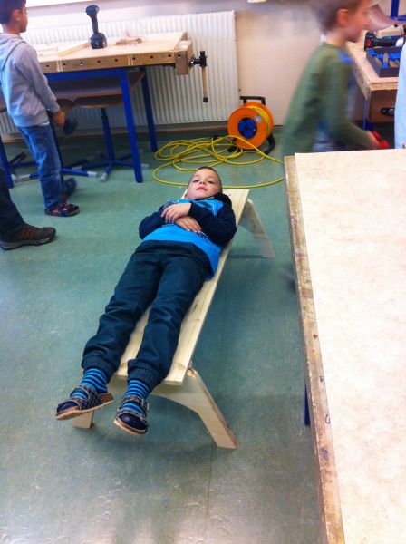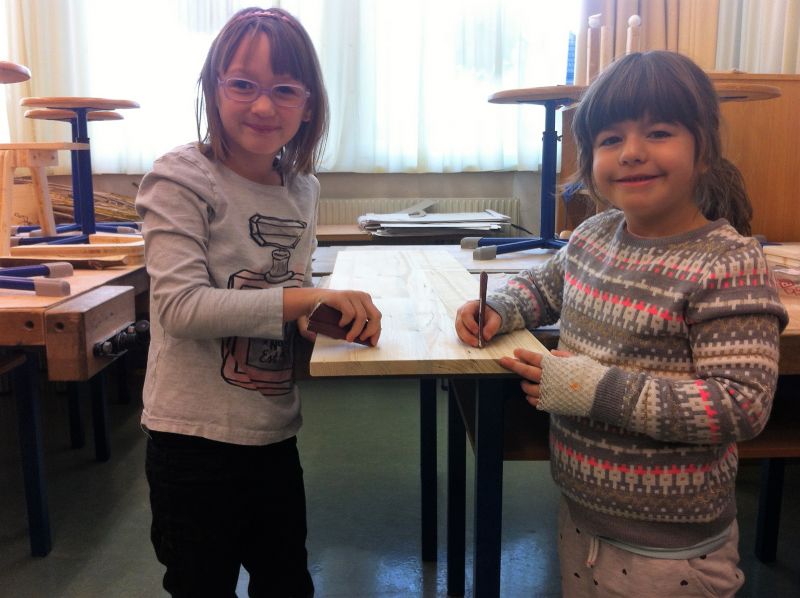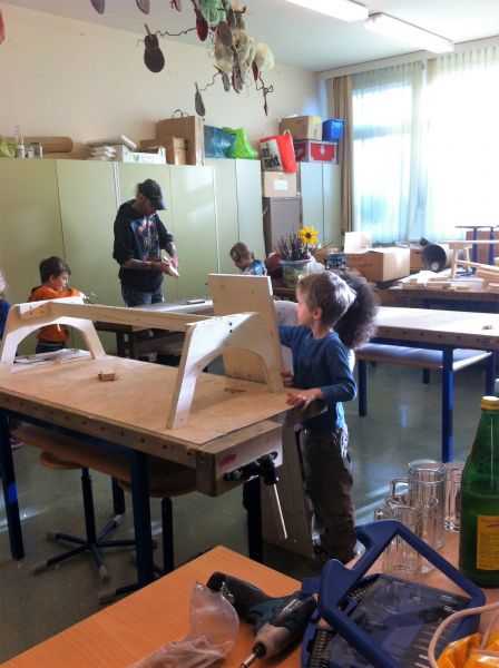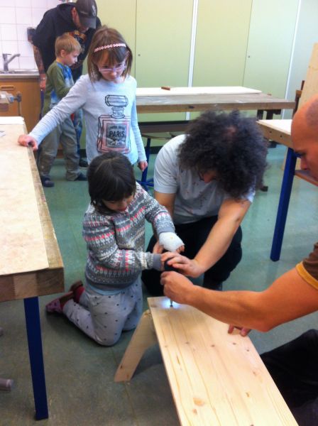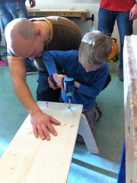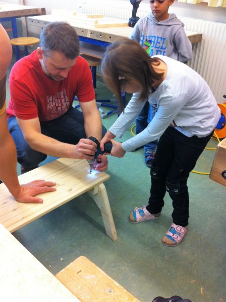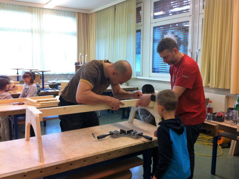 Mit der tatkräftigen Unterstützung von Vätern wurde mit den Kindern gemeinsam gemessen, gesägt, geschliffen, geschraubt und lackiert. Das Ergebnis kann sich sehen lassen - sechs tolle Sitzbänke für die Klasse!
